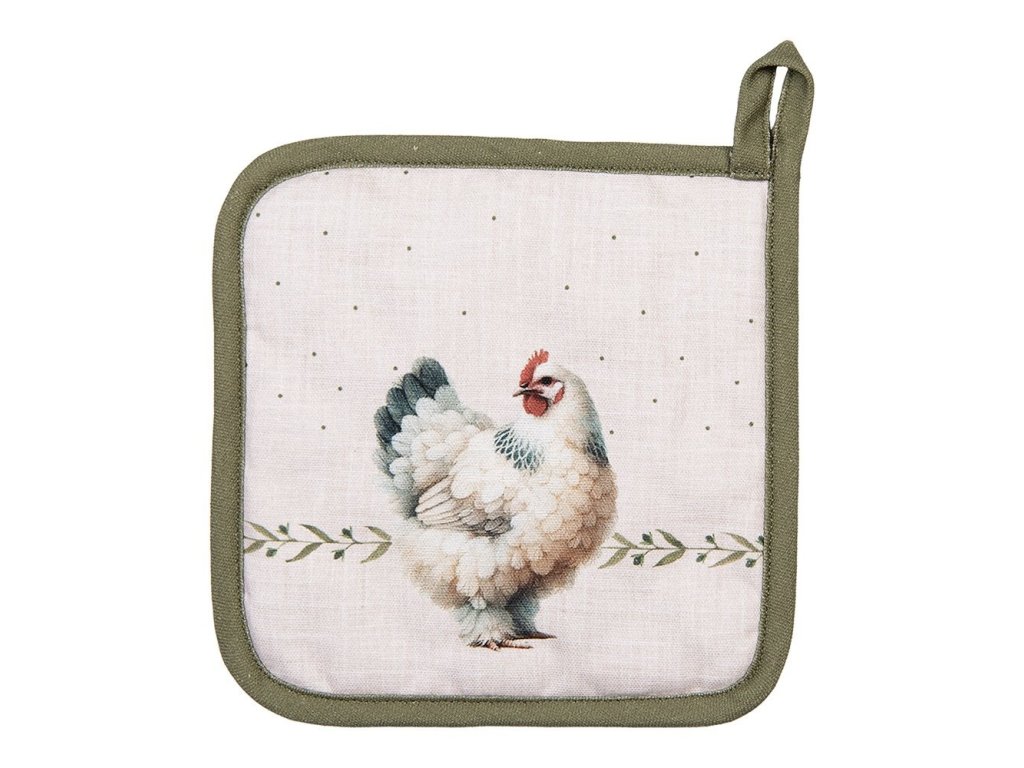 Vidiecka atmosféra s béžovou bavlnenou chňapkou so sliepočkami.