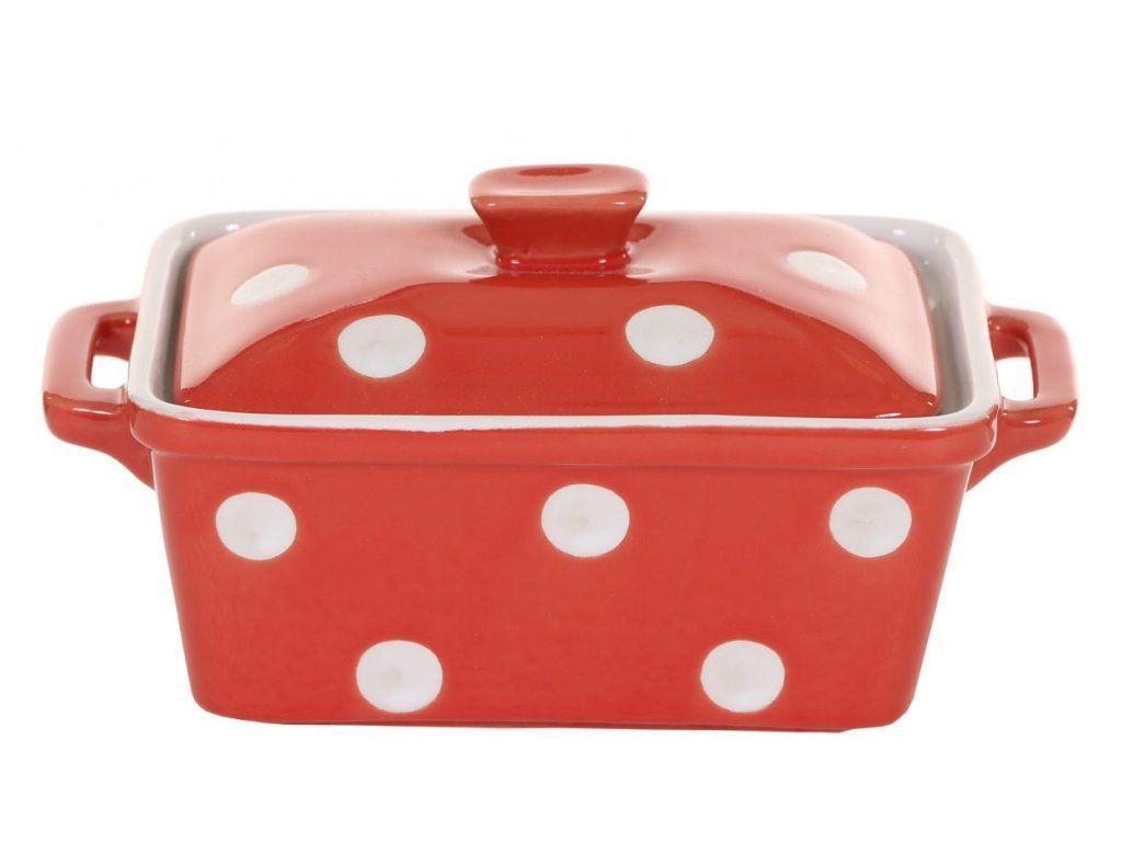 Červená miska na maslo s bodkami sa dá použiť aj na pečenie v rúre alebo len na maslo v chladničke.