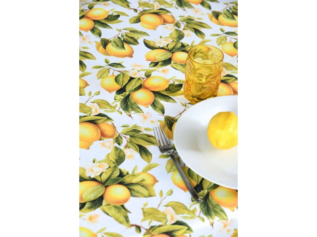 Obrus s povrchovou úpravou odolnou proti škvrnám, motív citrónov k vám prinesie slnko a teplo letných dní.