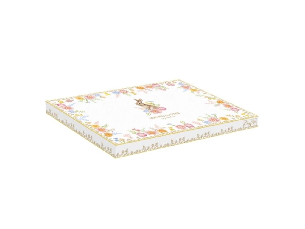 Túto kolekciu zdobí detailná ilustrácia zajačika obklopeného poľnými kvetmi, pričom jemné farebné odlíšenie okrajov (modrá, oranžová, ružová a žltá) jej dodáva dynamiku a šarm.