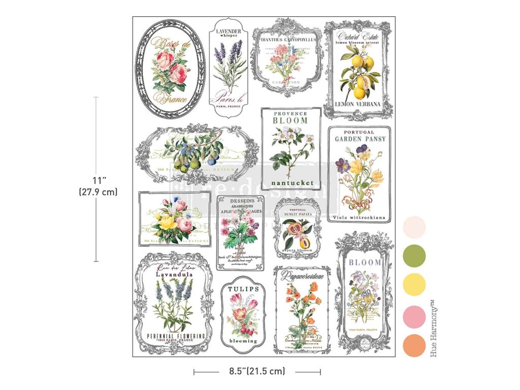 Jemne kvetinové motívy a vintage elegancia sa stretávajú na tomto krásnom trasfere. Kvety, botanické štítky a zdobené rámčekové motívy s jemnými detailmi – ruže, vetvičky levandule, fialky, tulipány a citrusové kvety sú vykreslené v nadčasových akvarelových odtieňoch.