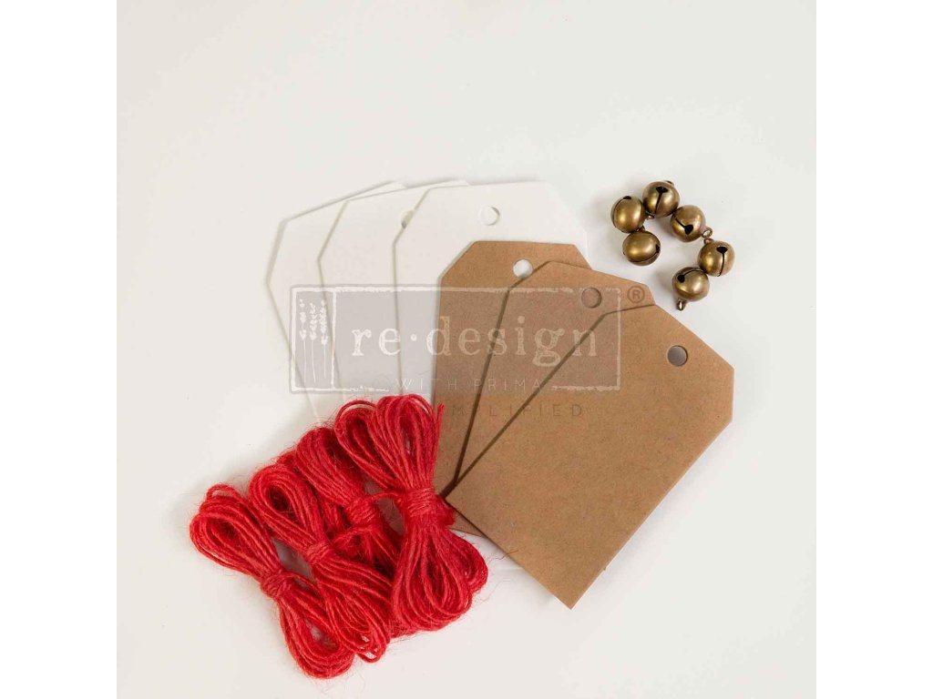 Táto sada obsahuje šesť štítkov (3 štítky s rozmermi 5,8 x 12 cm 3 štítky s rozmermi 5 x8,9 cm) šesť zvončekov (rolničiek) špagát.